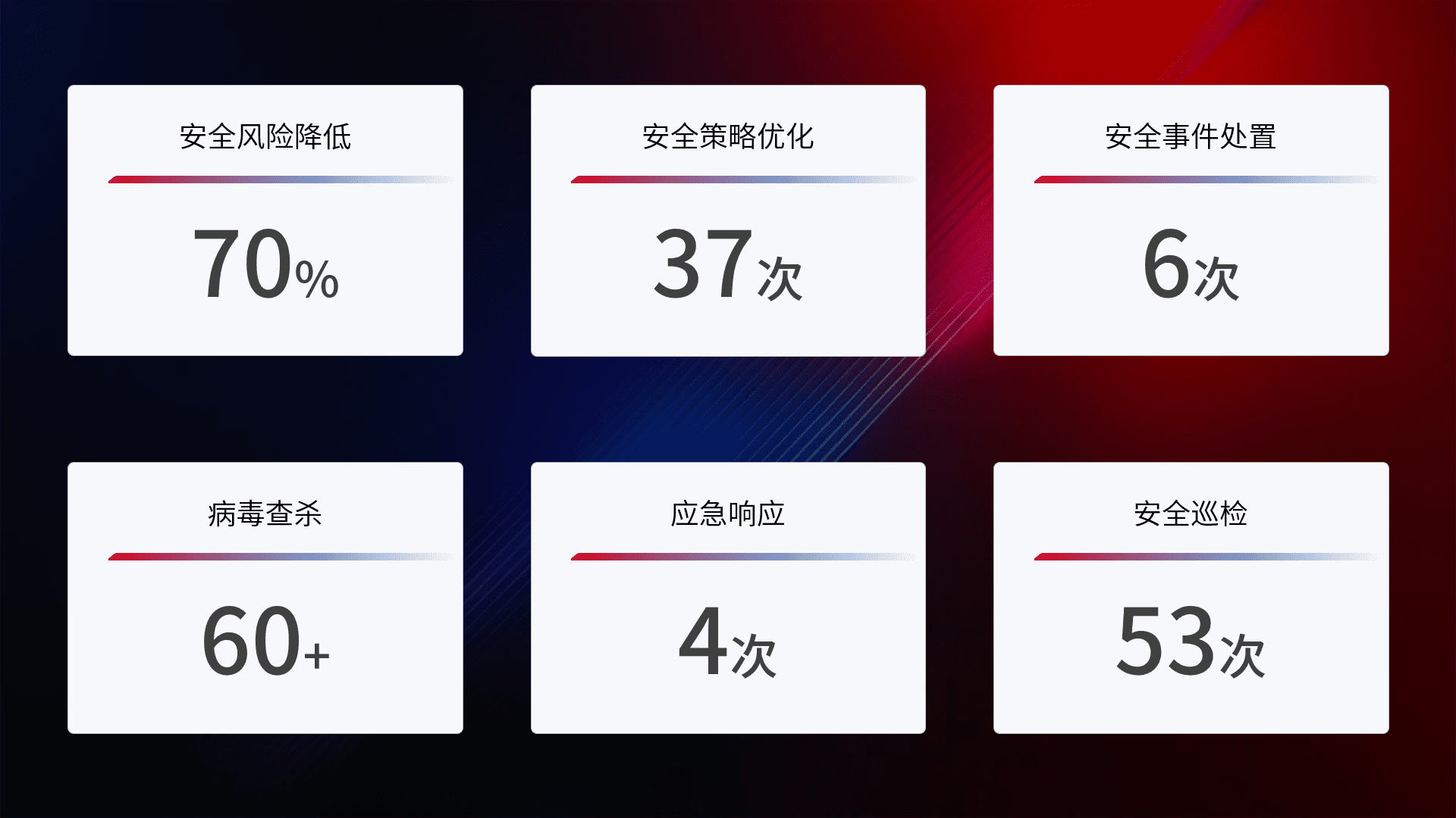 提供全面的安全事件报告体系,,包括处置报告、、周报、、季度和年度总结,,,,结合持续监控,,帮助客户深入了解网络安全状况。。。。